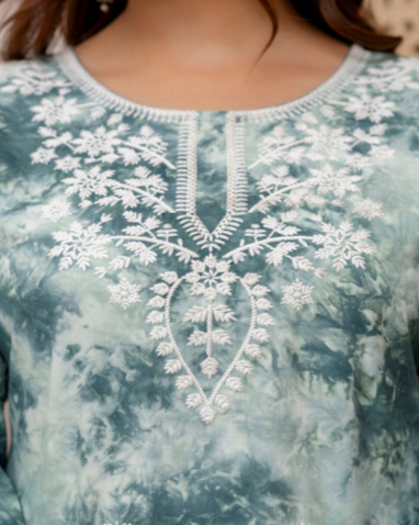 Women's Green Rayon Embroidered Top – Tie-Dye Effect, Floral Neck Design