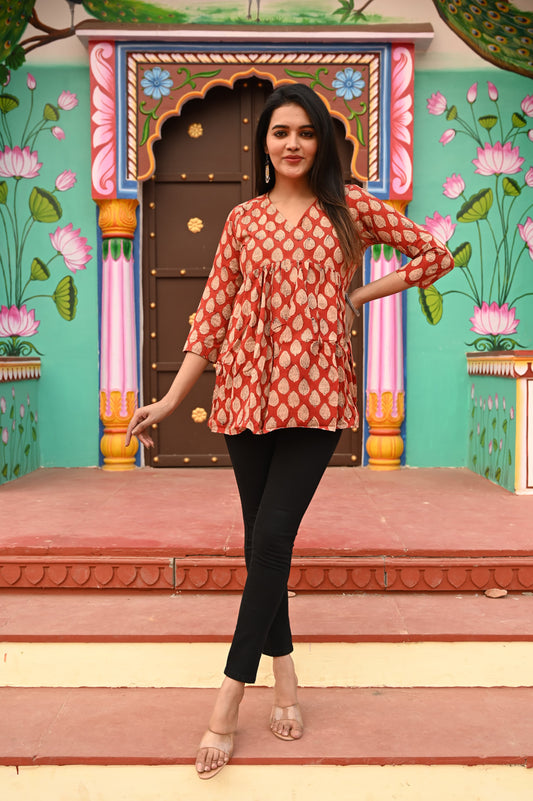Handblock Cotton Peplum Kurti – Red & Gold Leaf Motif
