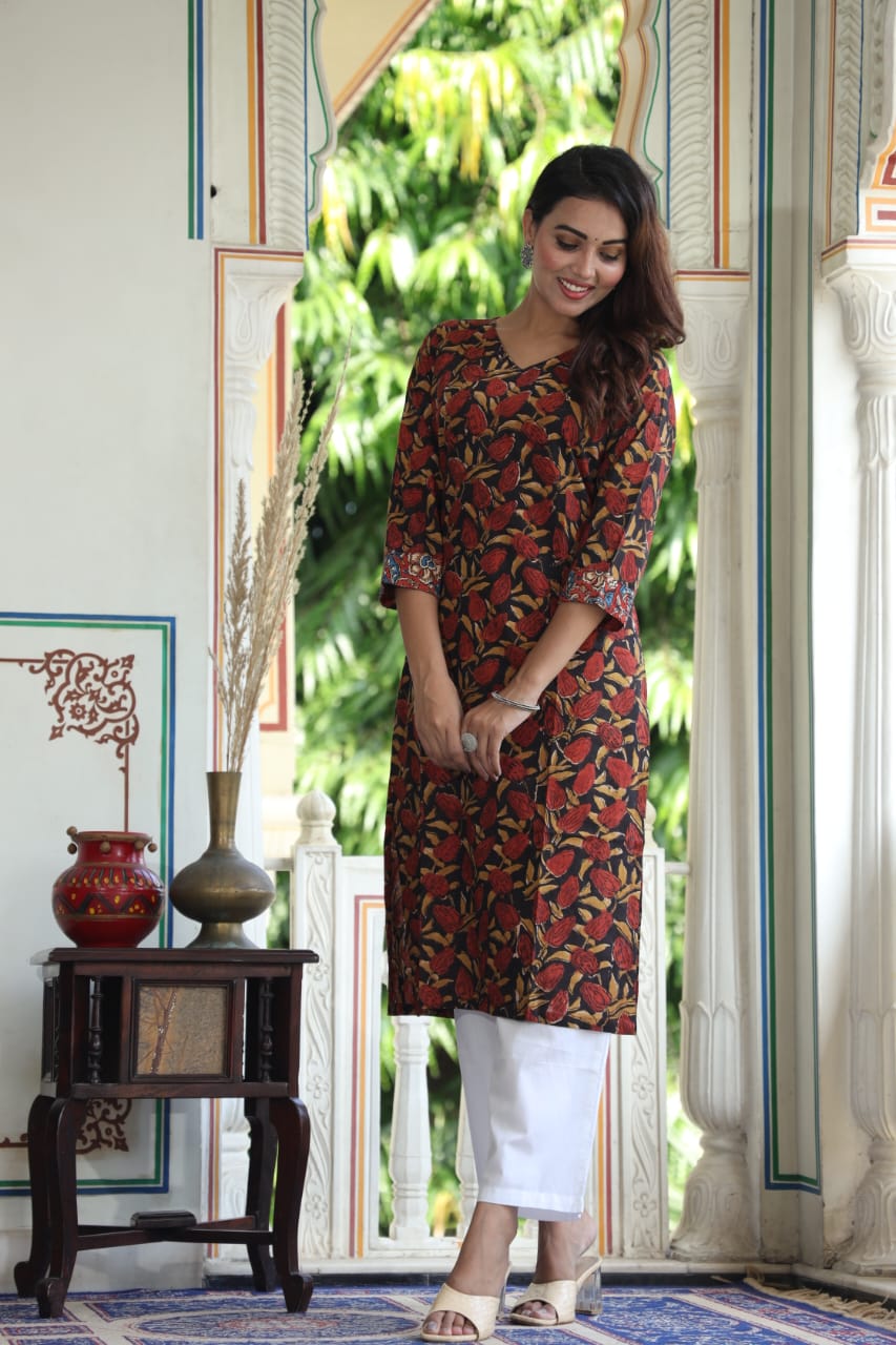 Autumn Leaf Printed Black Cotton Kurta – Elegant V-Neck Straight Fit for Women