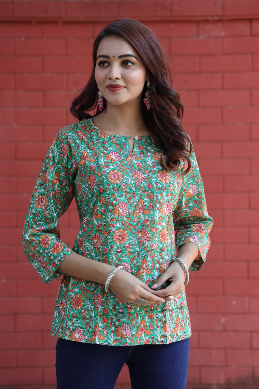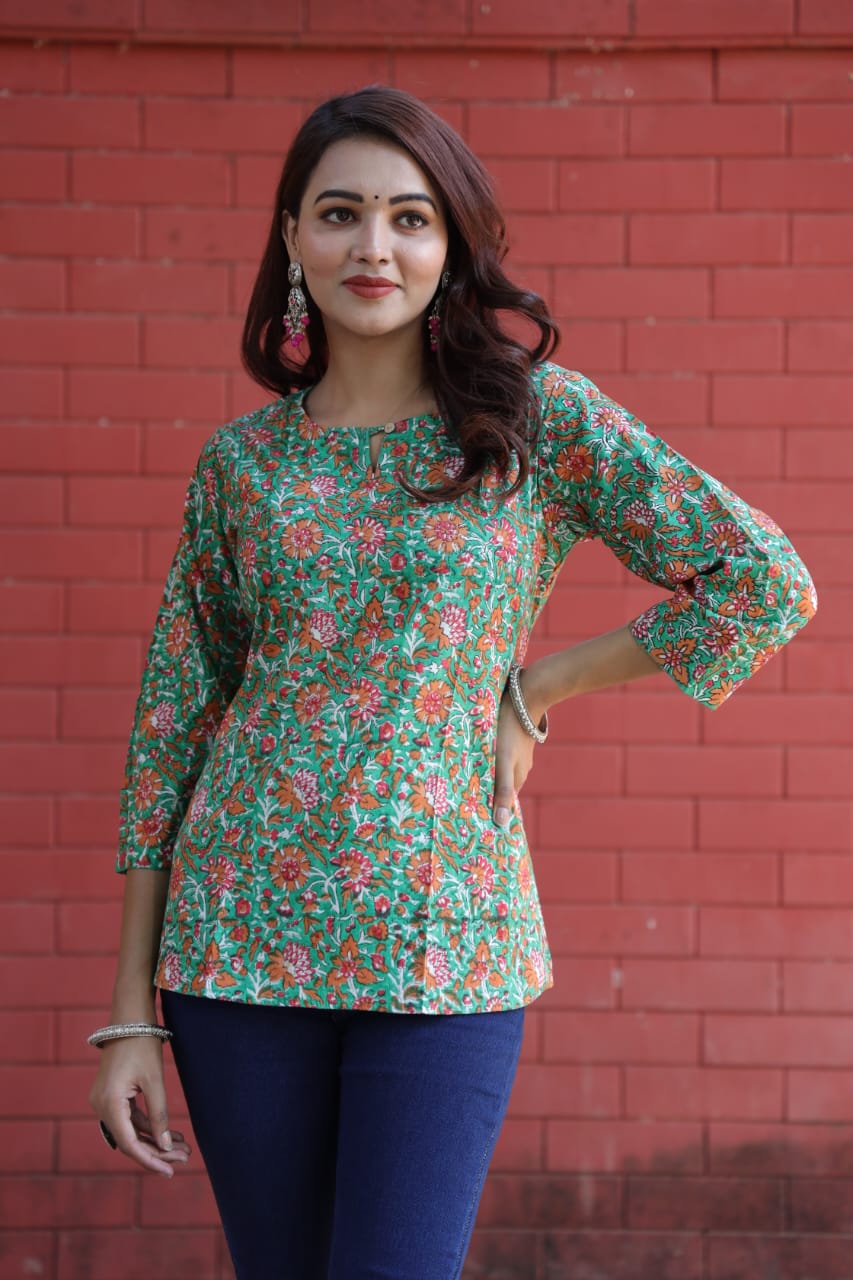 Forest Green Floral Bagru Print Kurti