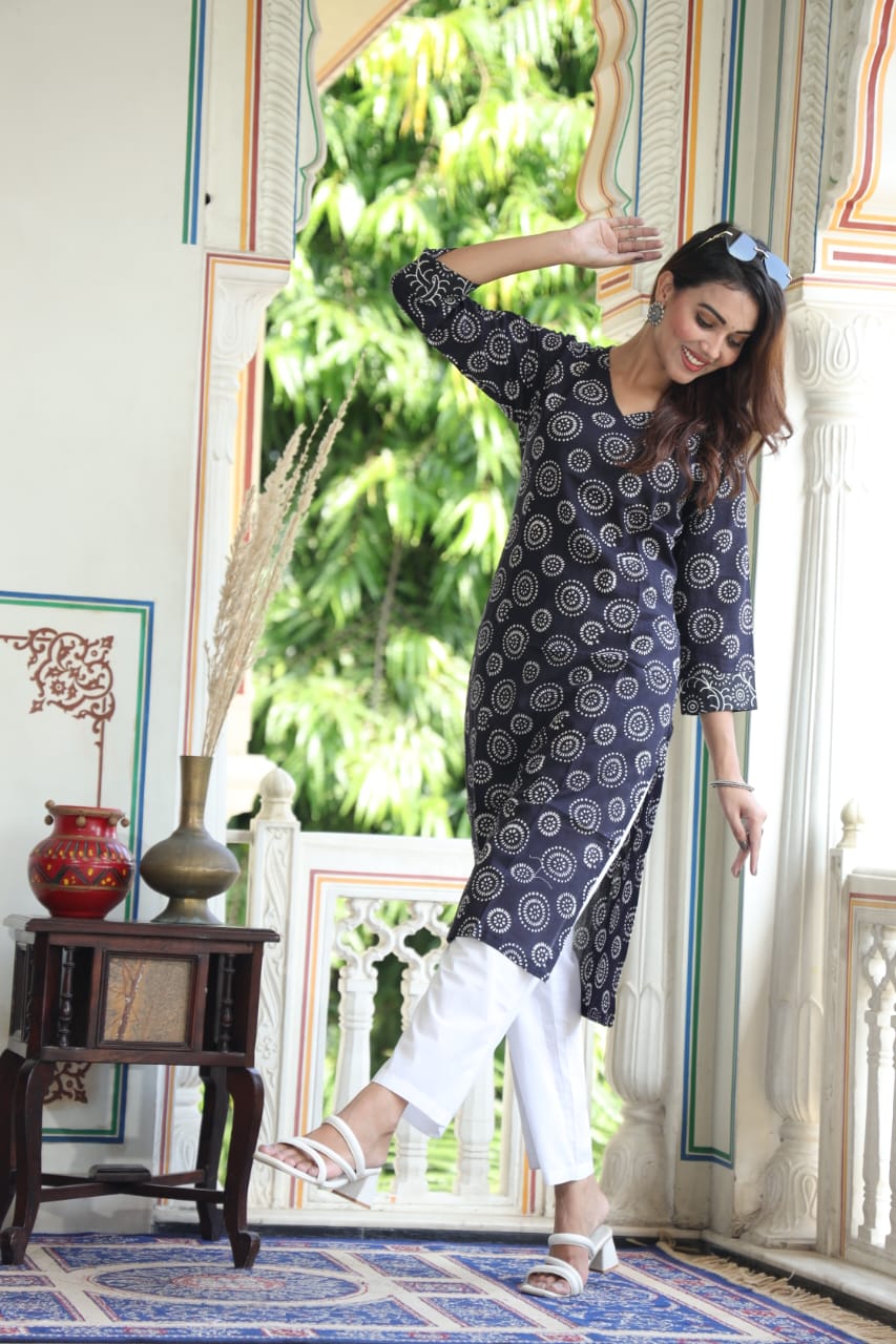 Add a refreshing twist to your ethnic wardrobe with this dark blue cotton kurta, adorned with symmetrical white circular prints. Featuring a smart V-neckline and 3/4th sleeves, this straight-fit design flatters all body types and ensures comfort all day long.