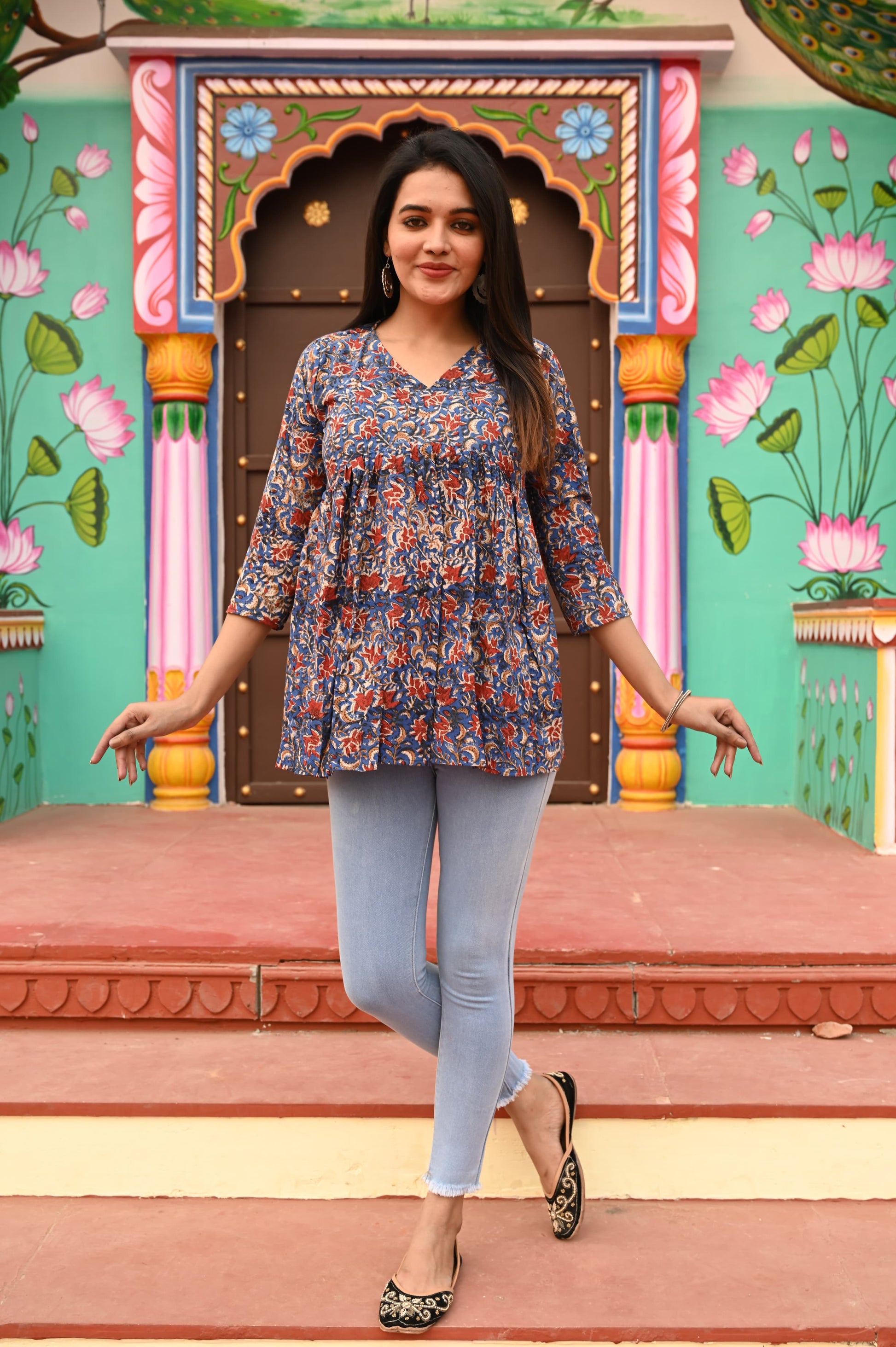 Make a timeless statement with this blue-red cotton top featuring intricate block print inspired patterns. With its comfy silhouette and ethnic charm, this piece works for both casual and semi-formal days. Traditional feel with a modern touch.